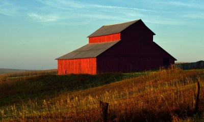 red barn at sunrise